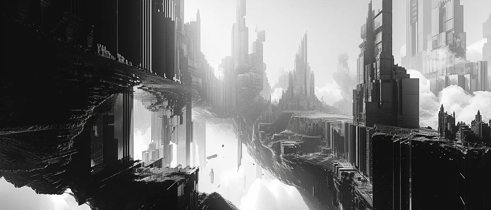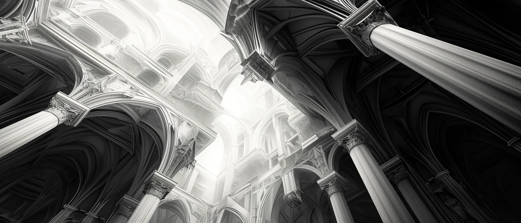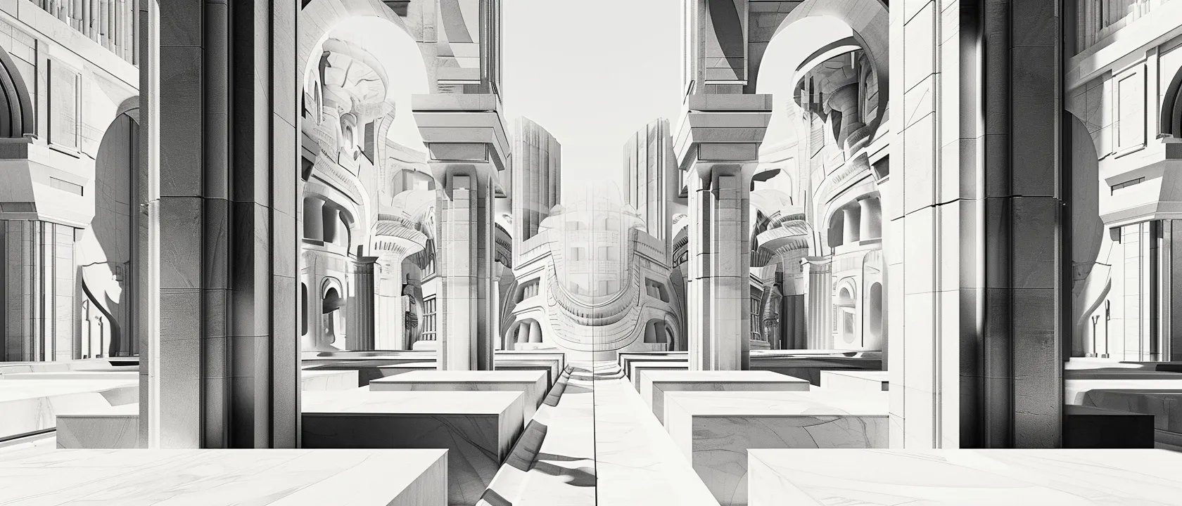 Aesthetic: A visual language that blends classical motifs (Renaissance art, architectural forms) with futuristic minimalism (clean lines, monochromatic palettes, silver accents).